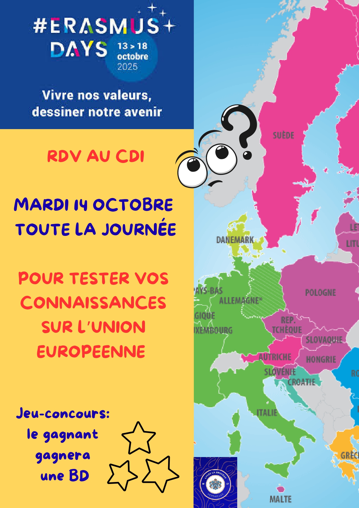 Les #ErasmusDays reviennent du 13 au 18 octobre 2025 pour une neuvième édition consacrée aux valeurs européennes. Pour promouvoir le programme d’échange européen dont le lycée La Bruyère fait partie, les élèves de Première ont réalisé une exposition. (...)